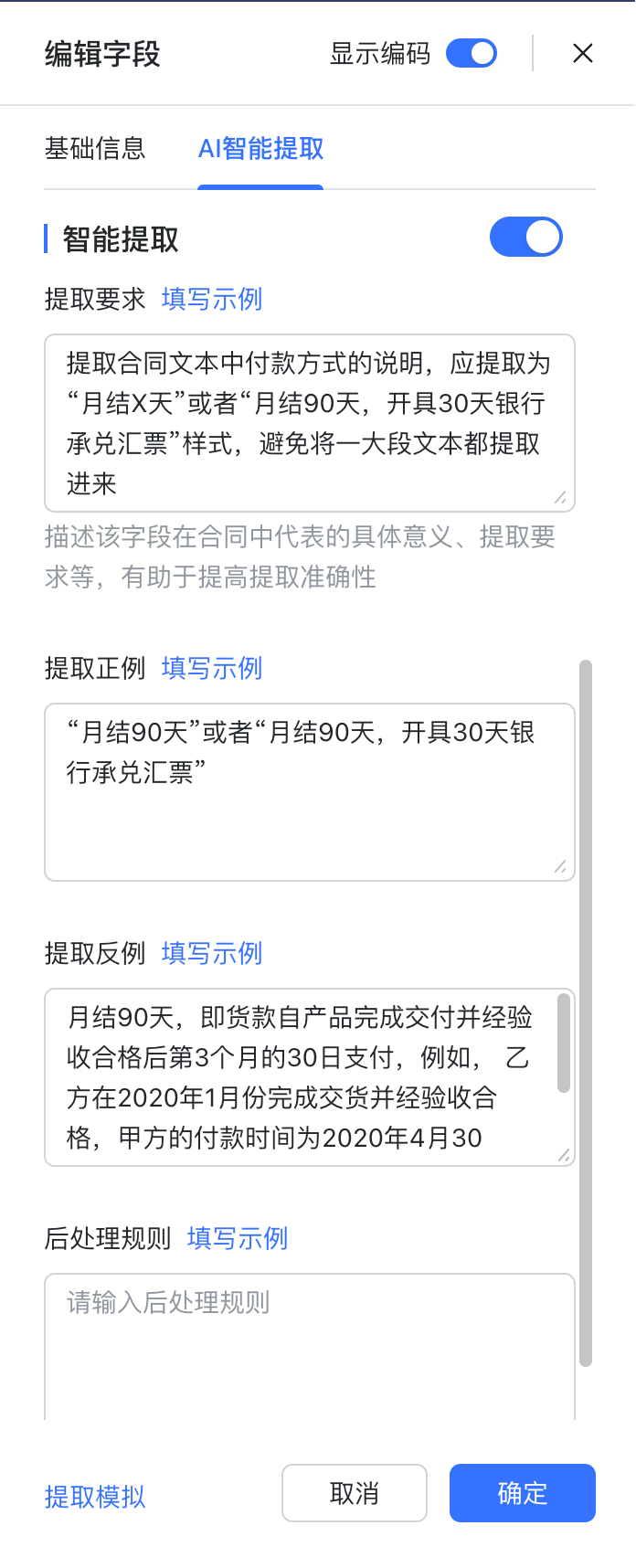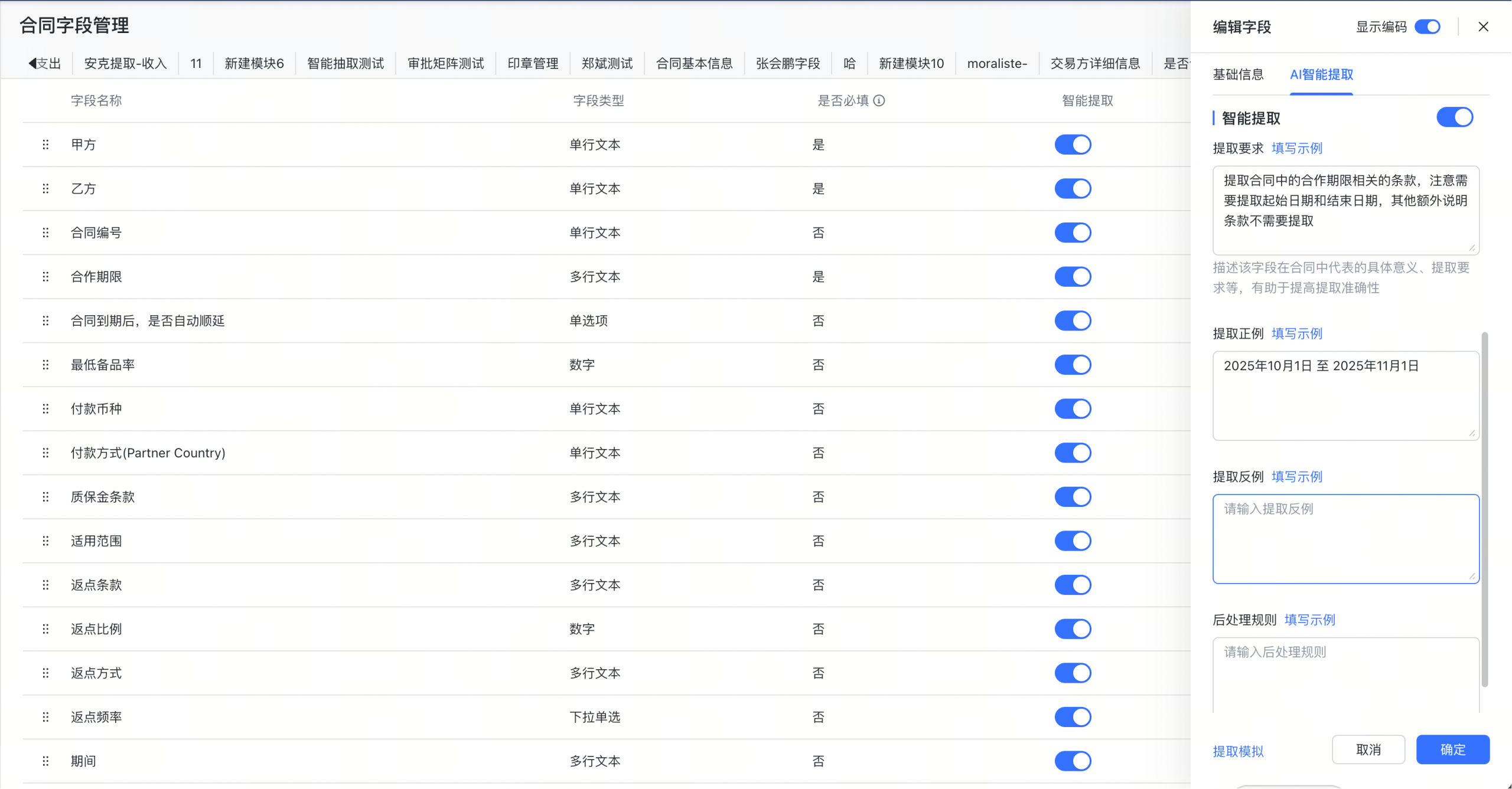 - 用户自定义规则:管理者可为特定字段配置提取规则、正反例等规则,提取的字段更贴合实际业务,让AI越用越“懂你”。
