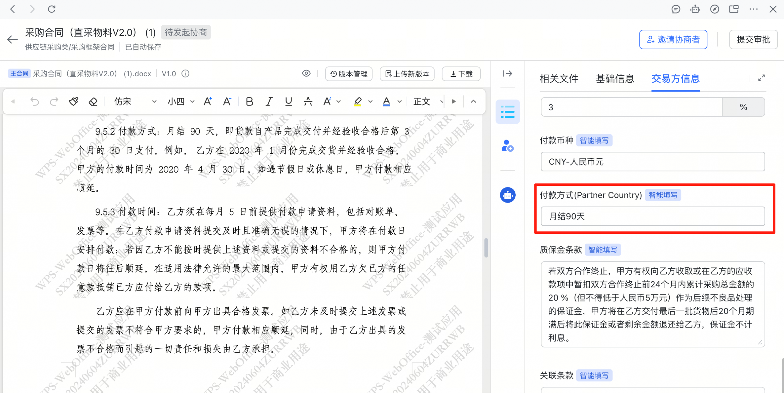 - 功能场景:企业人员发起非标准化合同时,AI 支持提取合同核心要素,自动填充至结构化的合同表单中。