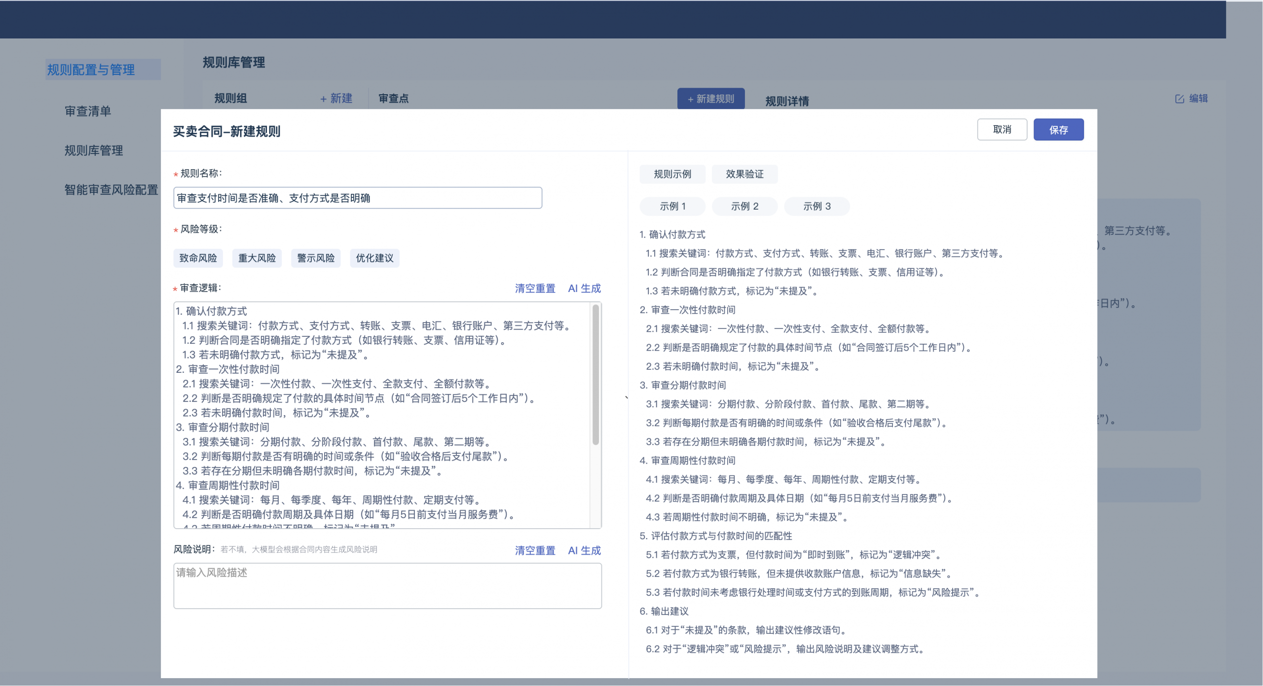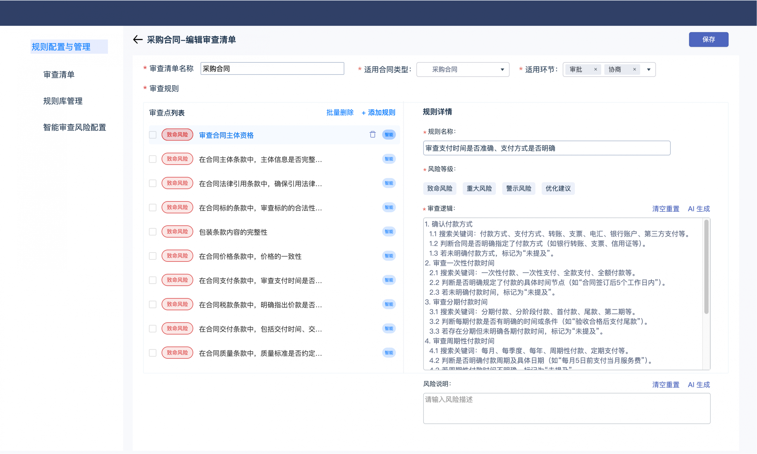 - 自定义审查清单:企业可根据自身业务特性(如采购、销售、投融资)可自定义审查要点,打造专属风控体系。