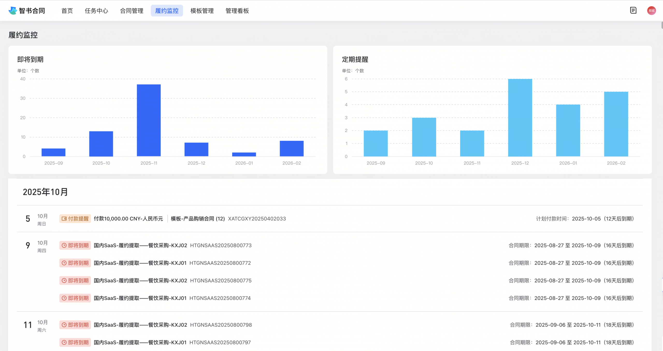 - 全景履约看板:实时查看所有合同的履约状态,风险提前预警,掌控全局。