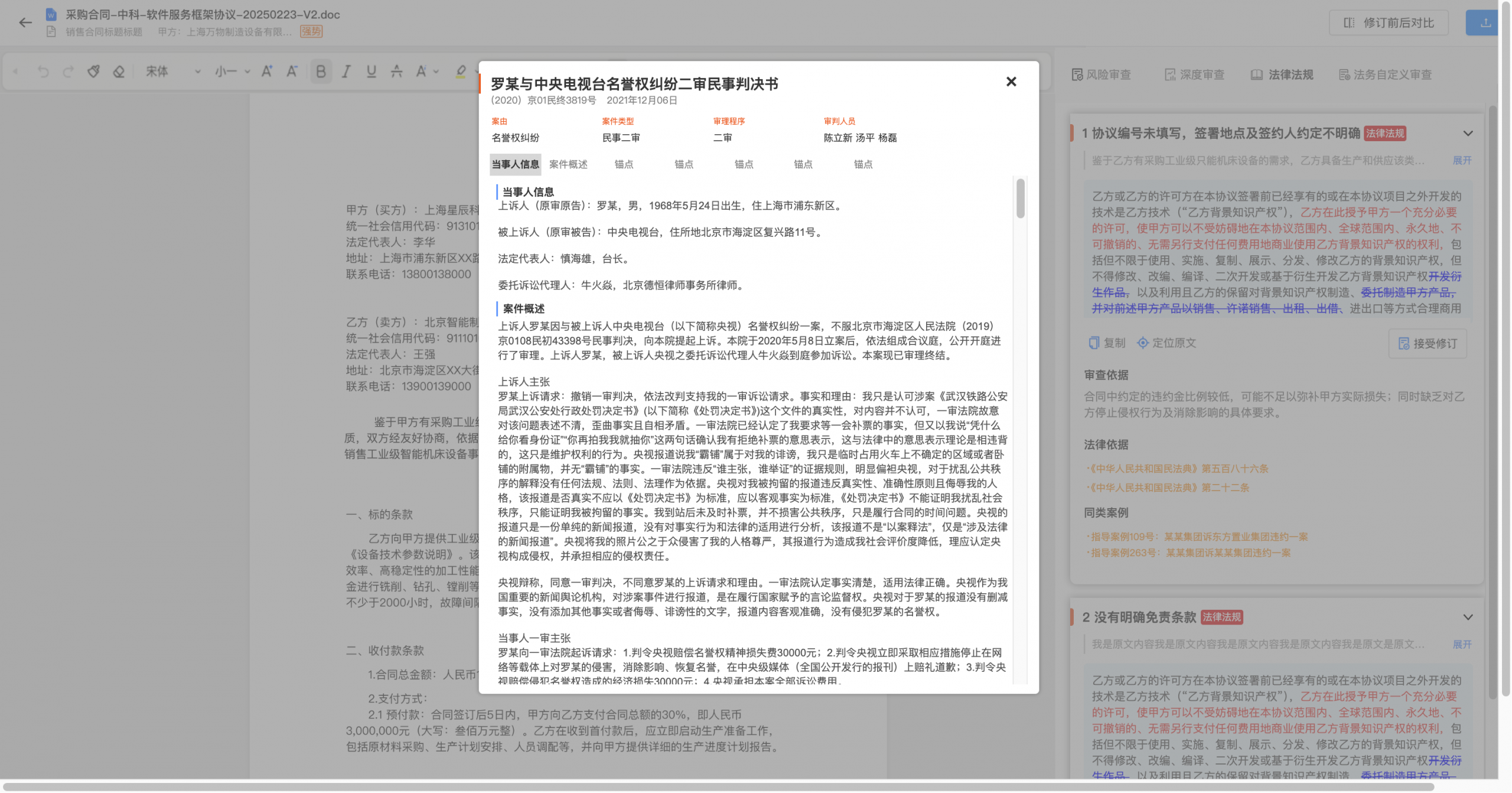 - 法律法规审查:无缝对接北大法宝司法库,自动关联风险条款背后的法规依据和相似判例,让风险可感知